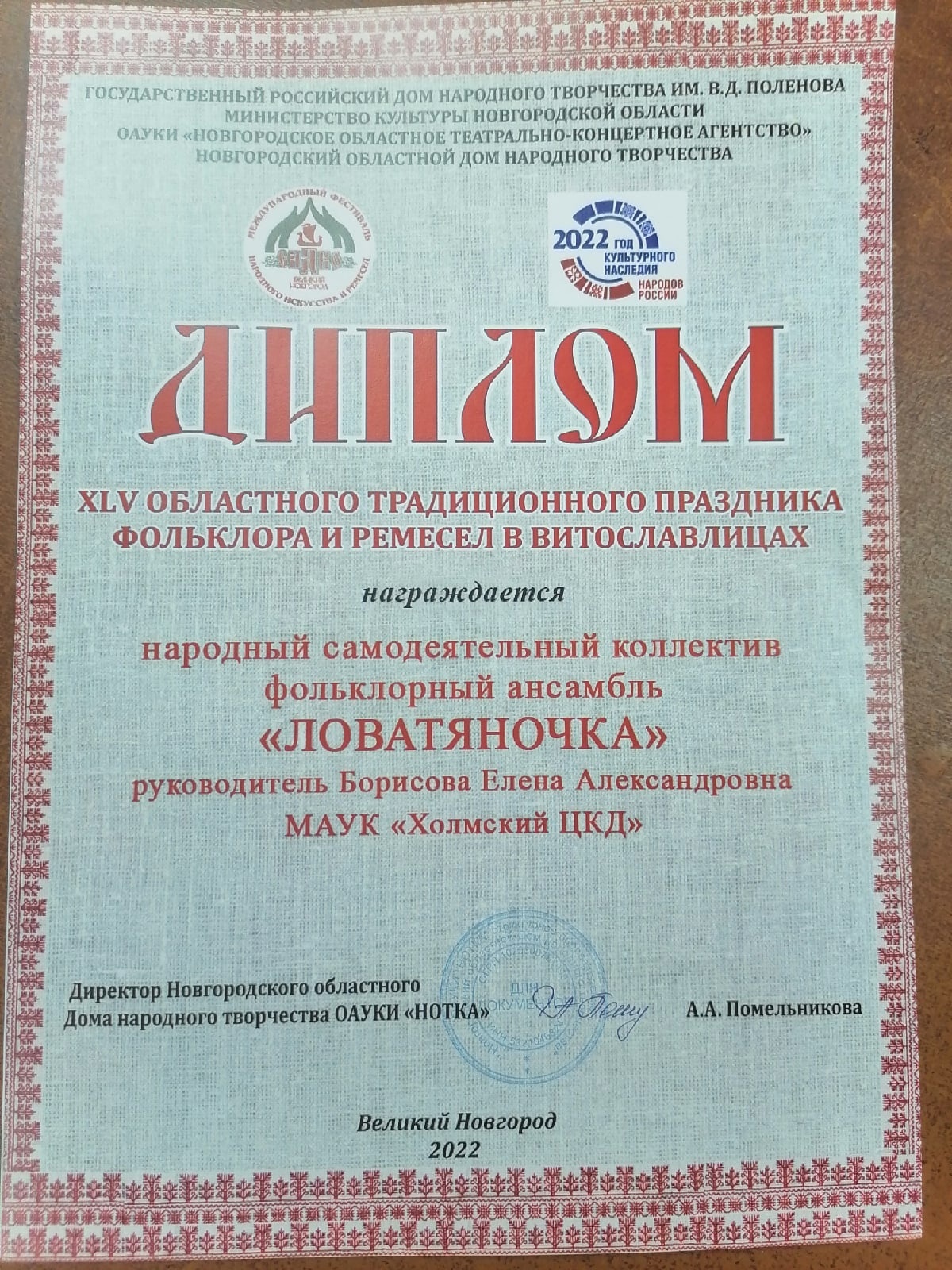 26 июня народный самодеятельный коллектив «Ловатяночка» (рук.Е.А.Борисова) принял участие в XLV областном традиционном празднике фольклора и ремесел в Витославлицах г.В.Новгород