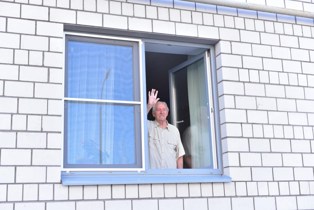 Ветерана также поздравили юнармейцы, они прошлись строевым маршем под окнами Николая Коновалова.