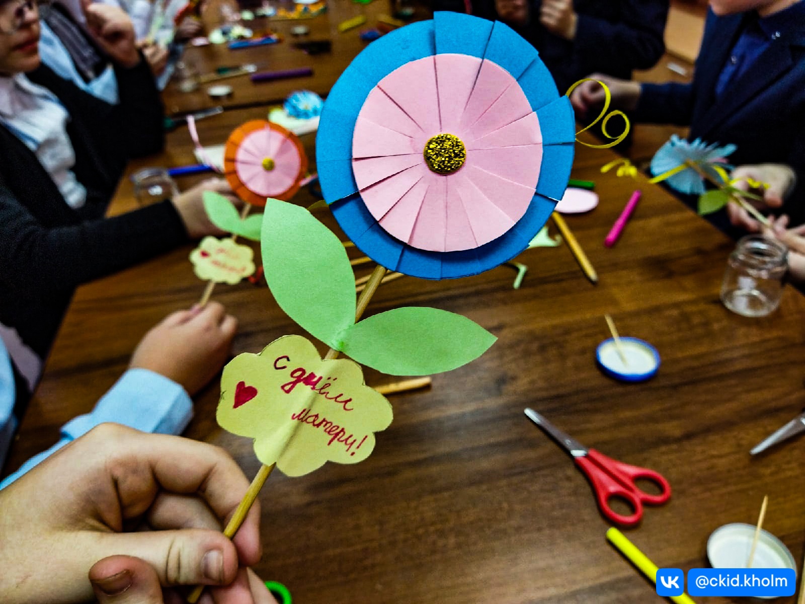 Сегодня в гости, в Дом народного творчества приходили учащиеся средней школы г.Холма. Для них был проведен мастер-класс, на котором дети изготовили "Цветок для мамы"