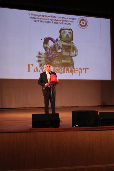 На Гала-концерте победителей конкурса "Все народы в гости к нам" мэр Великого Новгорода Александр Розбаум поздравил и поблагодарил директора Новгородской детской музыкальной школы русского фольклора Марину Бурьяк с недавней победой в федеральном проекте "Золотые имена народов России".