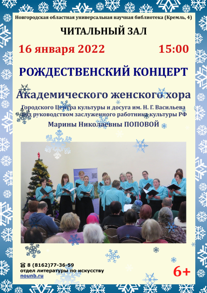 Завтра, 16 января, в 15.00 в читальном зале Новгородской областной библиотеки состоится Рождественский концерт Академического женского хора Городского центра культуры и досуга им.