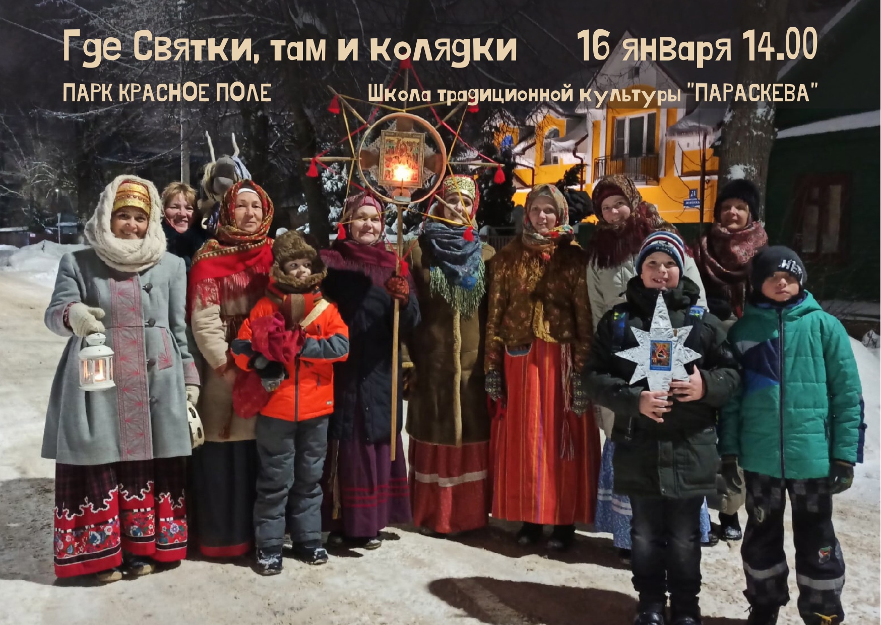 Погрузиться в мир русских традиций гостям поможет фольклорный коллектив школы традиционной культуры «Параскева», который будет исполнять весёлые песни-колядки с пожеланиями добра и счастья. Программа будет рассчитана как для взрослых, так и для детей.