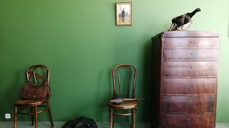 Часть экспозиции воспроизводит интерьер комнаты дворянина-охотника — здесь представлены охотничьи принадлежности из фондов Новгородского музея-заповедника: охотничье двуствольное ружьё фирмы Ланкастера, ружьё работы тульского мастера Грязнова, патронташ 1835 года, а также охотничьи сапоги и пороховница XIX века. Завершают выставку ловчие сани и чучело волка.