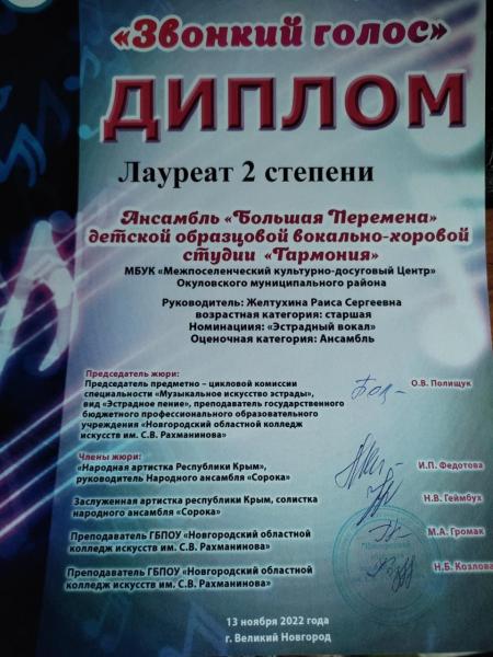 Ансамбль «Большая перемена» студии «Гармония» получил диплом Лауреата 2 степени.