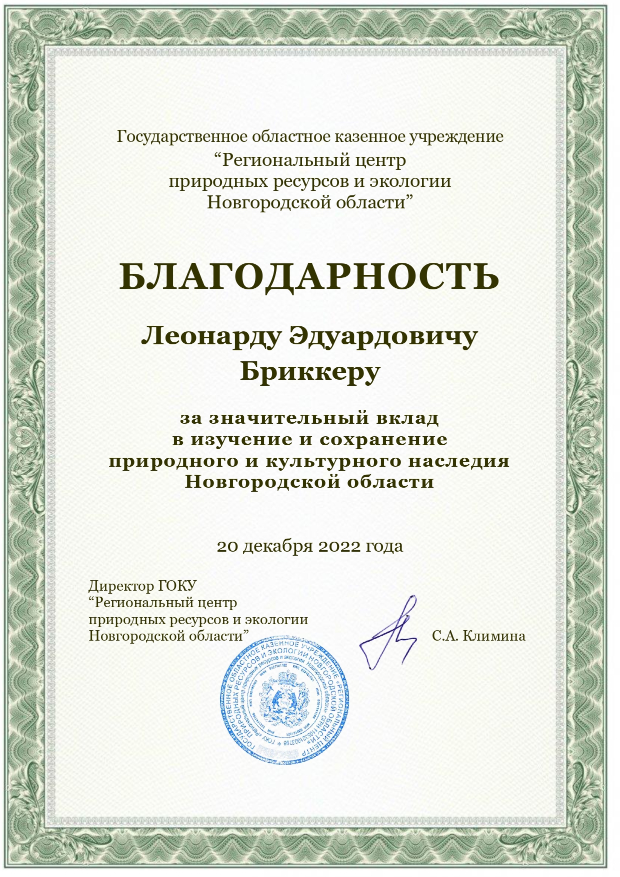 Региональный центр природных ресурсов и экологии Новгородской области благодарит Леонарда Эдуардовича Бриккера за плодотворную работу, направленную на сохранение природного и культурного наследия Новгородской области, и желает доброго здоровья, благополучия и многих сил для осуществления творческих замыслов!