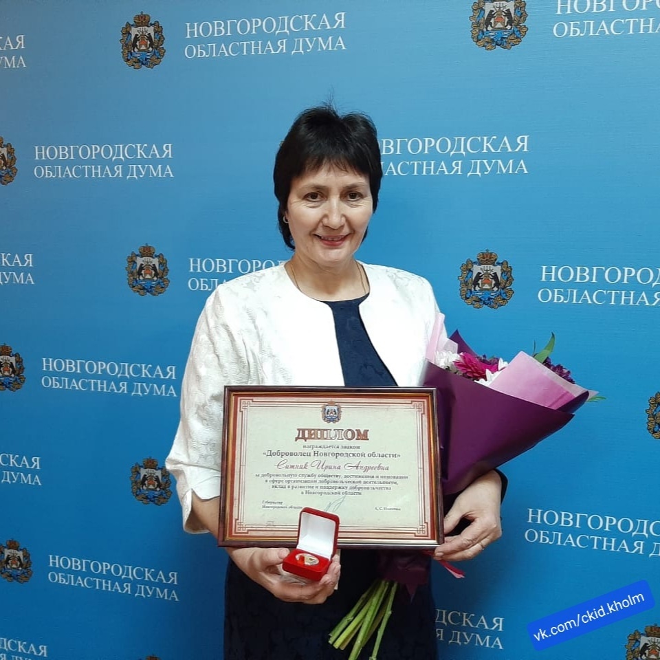 Знаком "Доброволец Новгородской области", Ирина Андреевна награждена на "Торжественной церемонии вручения государственных наград Российской Федерации и наград Новгородской области".