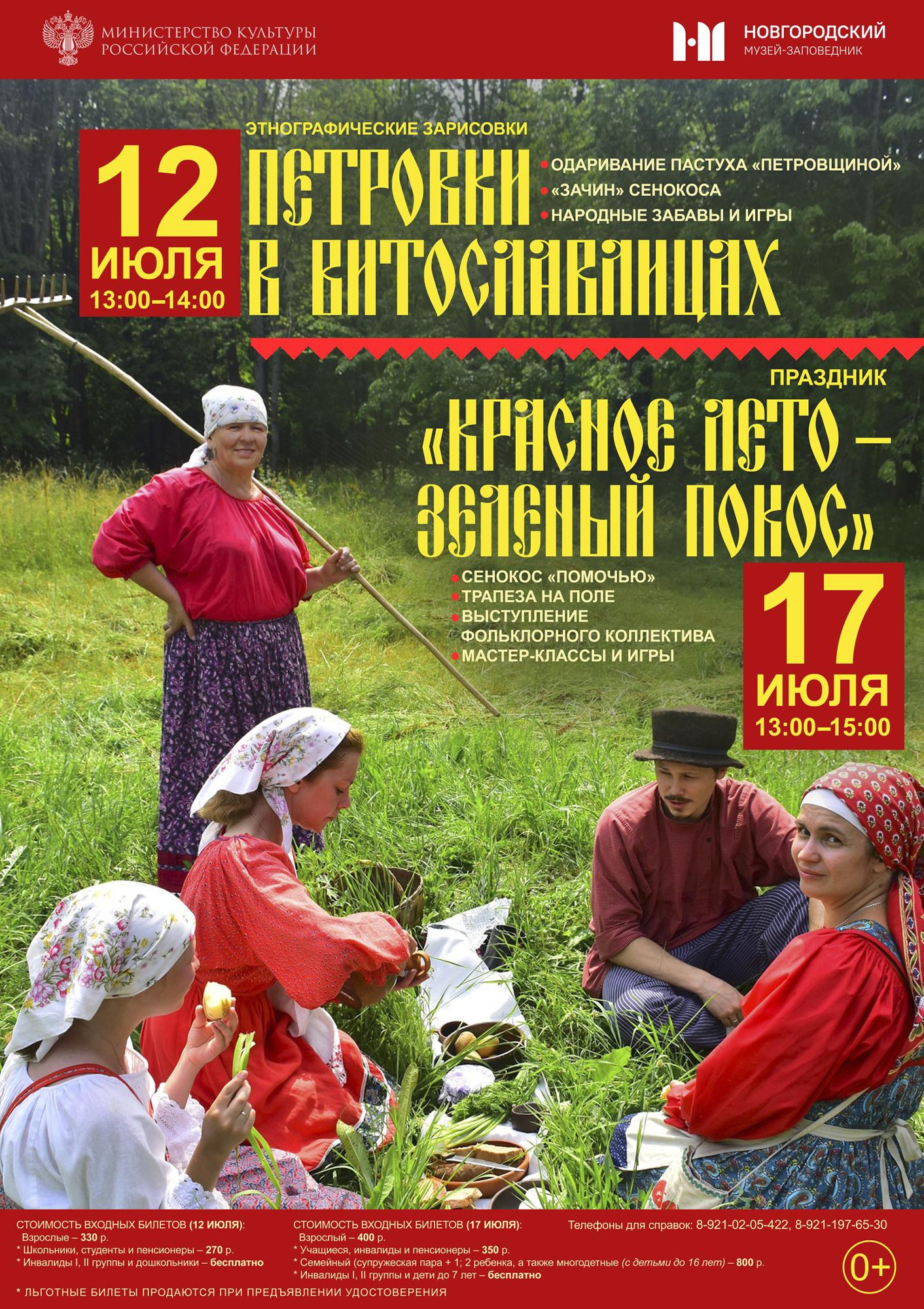17 июля с 13 до 15 часов в Музее народного деревянного зодчества «Витославлицы» пройдет праздник «Красное лето – зеленый покос». В программе: сенокос «помочью», рассказ о сенокосной страде, трапеза на поле после покоса, отбивание косы, фотографирование в народных костюмах, мастер-классы, народные забавы, хороводы и игры с фольклорным коллективом.