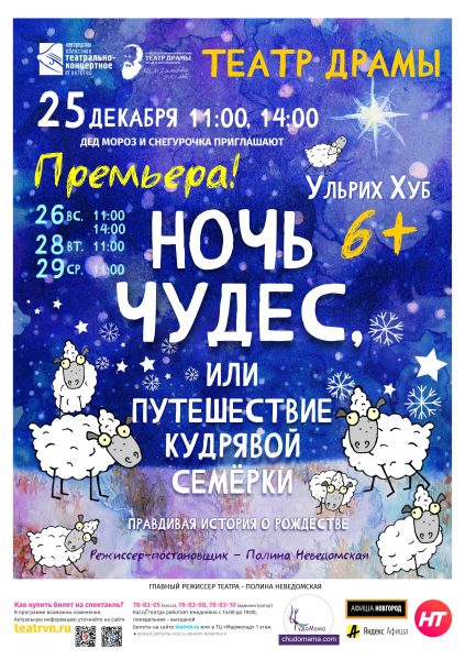 Новгородский академический театр драмы им. Ф.М.Достоевского готовит новогоднюю постановку «Ночь чудес, или путешествие кудрявой семёрки». Впервые в России будет поставлен спектакль по новой книге Ульриха Хуба - признанного немецкого детского писателя и автора бестселлера «Ковчег отходит ровно в восемь».