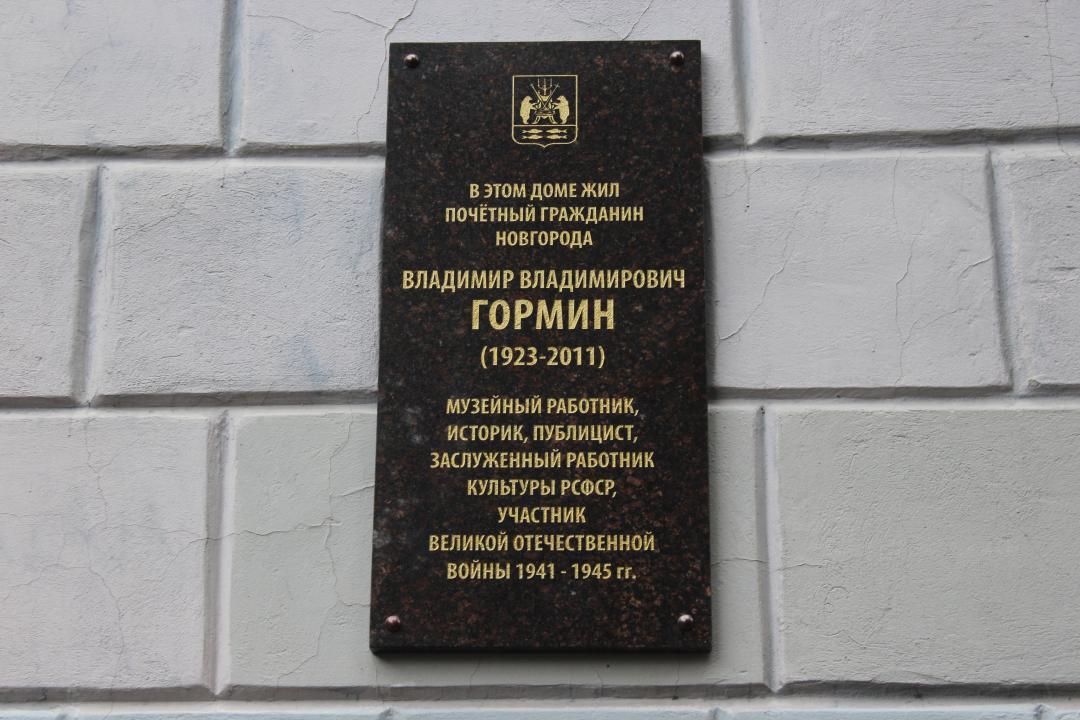 Владимир Владимирович Гормин родился 23 февраля 1923 года в г. Окуловка Новгородской области. 15 июня 1941 года с отличием закончил Окуловскую образцовую среднюю школу. Война внесла свои коррективы в планы молодого Гормина: сразу после выпускного вечера был призван и отправлен на ускоренное обучение в военное училище. Звание лейтенанта. Тяжелые бои под Харьковом. Отступление с боями. Прорыв из окружения. Сталинградская битва с первого до последнего дня. Участие в освобождении Донбасса, ранение, госпиталь. Затем фронтовые дороги Румынии, Болгарии, Венгрии. После войны Владимир Гормин приехал в Ленинград и поступил на философский факультет Ленинградского университета. Через 5 лет получил диплом с отличием. С 1951 года его жизнь и активная творческая деятельность были связаны с новгородской историей и культурой. В Новгороде он преподавал сначала в школе, затем в пединституте. Особый вклад В.В. Гормин внес в становление и развитие послевоенных новгородских музеев, развитие музейного дела. 34 года работал в Новгородском государственном музее-заповеднике, где прошел путь от экскурсовода до заместителя генерального директора по научной работе. Владимир Владимирович руководил и принимал непосредственное участие в создании всех основных экспозиций Новгородского музея. Неоценим его творческий вклад в деятельность по музеефикации памятников истории и культуры Великого Новгорода, создание на научной основе системы экскурсионного обслуживания горожан, туристов и экскурсантов. Автор многочисленных радио и телепередач, публикаций в местной печати, составитель множества путеводителей и буклетов, красочных фотоальбомов «Новгород», выпущенных издательствами «Аврора», «Лениздат», «Профиздат» и другими. В.В. Гормин награжден орденами «Отечественной войны» I и II степени, орденом «Красной Звезды», медалями «За отвагу», «За оборону Сталинграда», «За взятие Будапешта», «За победу над Германией». В 1978 году ему было присвоено звание «Заслуженный работник культуры РСФСР», в 1998 году В.В. Гормин удостоен звания «Почетный гражданин Новгорода» за большой личный вклад в развитие, сохранение и пропаганду культурного наследия г. Новгорода. В соответствии с решением Думы Великого Новгорода от 30.04.2020 № 413 на доме по ул. Газон, 5/2, где с 1955 по 1966 гг. проживал В.В. Гормин, в его честь установлена мемориальная доска.