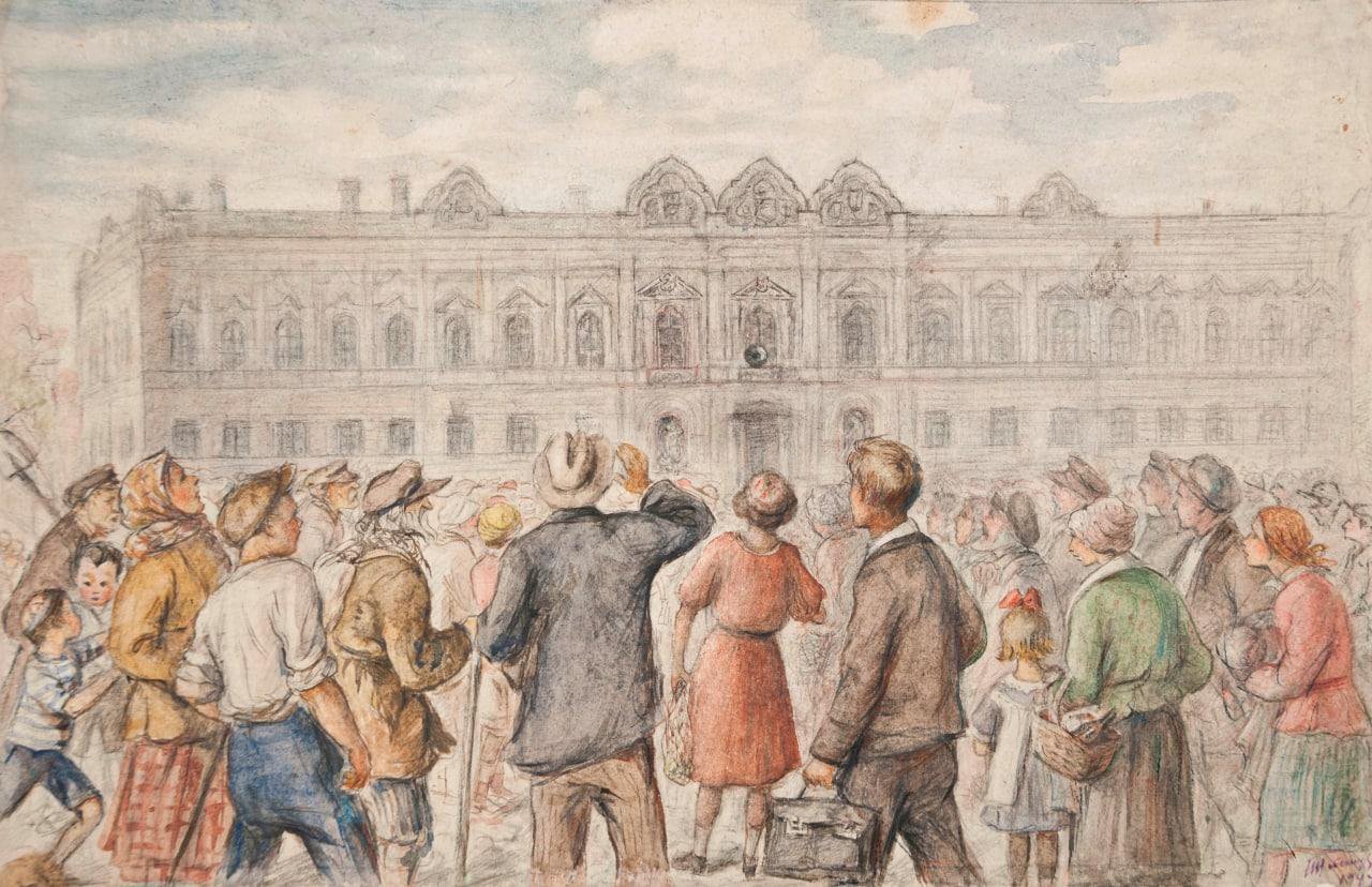 Иллюстрация: Татьяна Гиппиус. "Объявление войны по радио". Новгород. Собрание Новгородского музея-заповедника