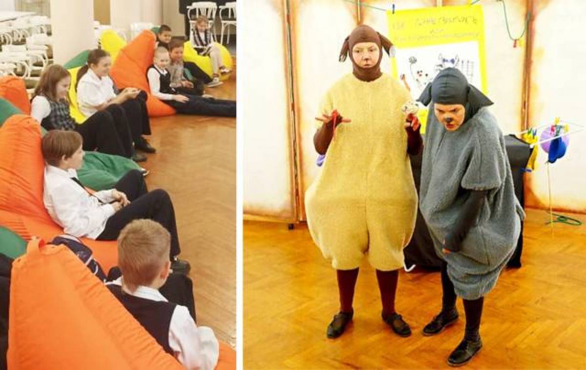 Конструкция спектакля строится на интерактивном общении с маленькими зрителями. А чтобы им было максимально удобно и они чувствовали себя как дома, стулья заменили на огромные кресла-мешки. Проекту дали название «Сказки на подушках».