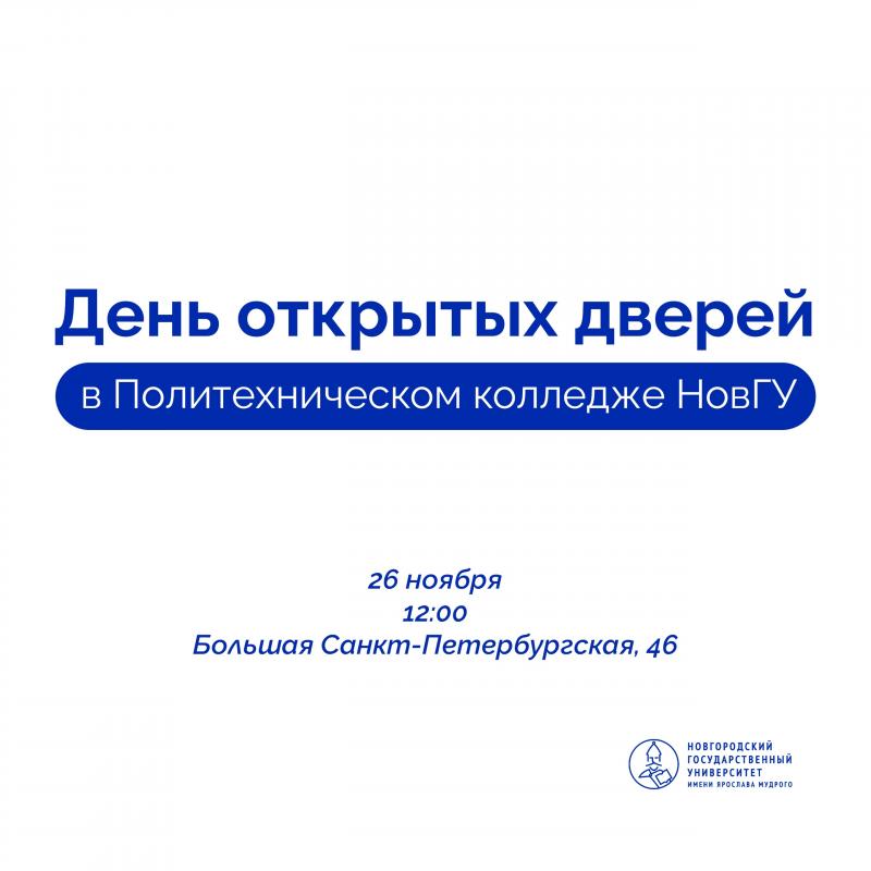 26 ноября в 12:00 часов Политехнический колледж Новгородского государственного университета приглашает абитуриентов и их родителей на День открытых дверей. по адресу: Великий Новгород, улица Большая Санкт-Петербургская, 46.