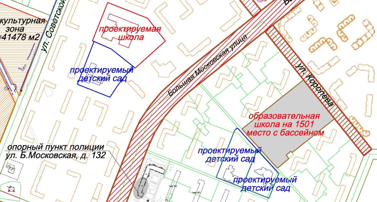 Кроме того, рядом с этой школой запланировано строительство двух детских садов. Информации о сроках нет, но земельные участки зарезервированы. То есть никакой другой объект на этих участках не построят.