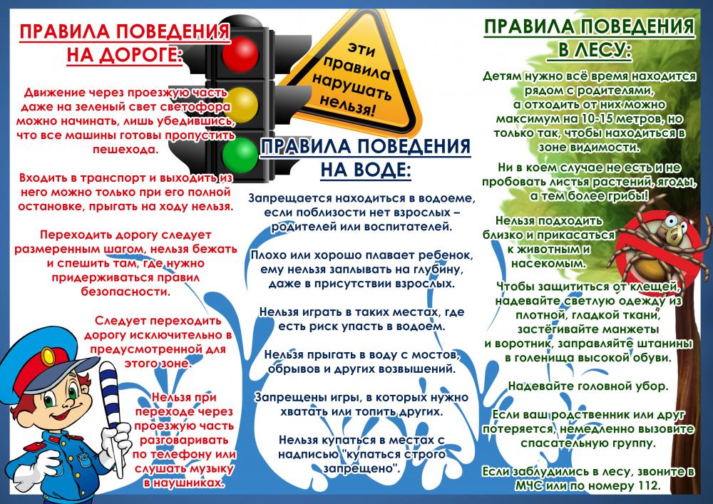 Во время каникул большую часть дня ребенок проводит, гуляя на свежем воздухе. Поэтому его нужно обязательно познакомить с правилами безопасного поведения на улице. Самое главное — не разговаривать с незнакомыми людьми и ни в коем случае не поддаваться на их уговоры пойти посмотреть на что-то или поехать покататься.