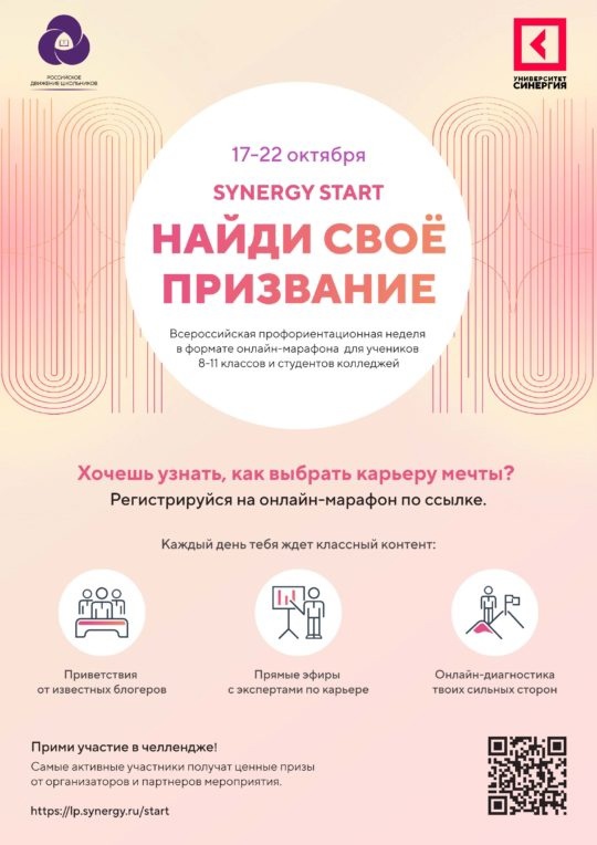 С 17 по 22 октября пройдёт Всероссийская профориентационная неделя для школьников и учащихся колледжей в формате онлайн-марафона «Найди свое призвание!». Организаторами мероприятия выступят Российское движение школьников совместно с Университетом «Синергия», при поддержке Комитета Государственной Думы по молодежной политике и Ассоциации негосударственного образования.