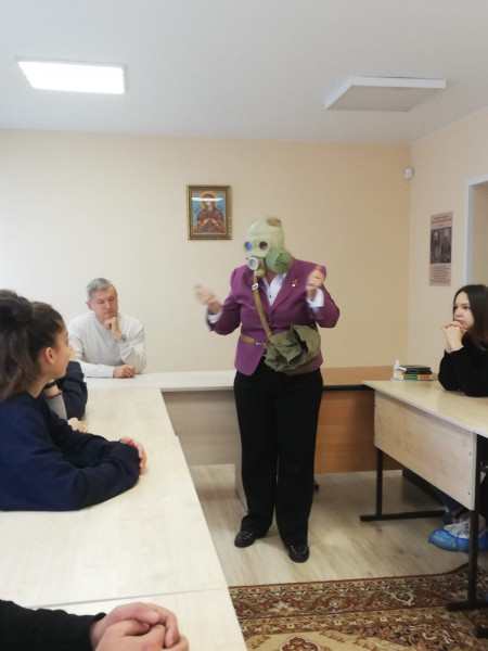 Галина Лопанова рассказала о том, что такое химическое заражение, химическое загрязнение, зачем нужны противогазы. Ребята изучили устройство противогаза и отработали надевание противогазов. Воспитанники клуба задавали вопросы по теме.