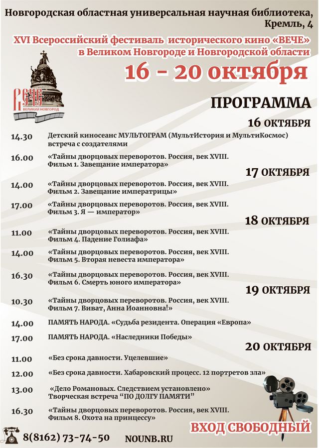 С 16 по 20 октября 2022 года Новгородская областная универсальная научная библиотека станет одной из площадок XVI Всероссийского фестиваля исторических фильмов «Вече».
