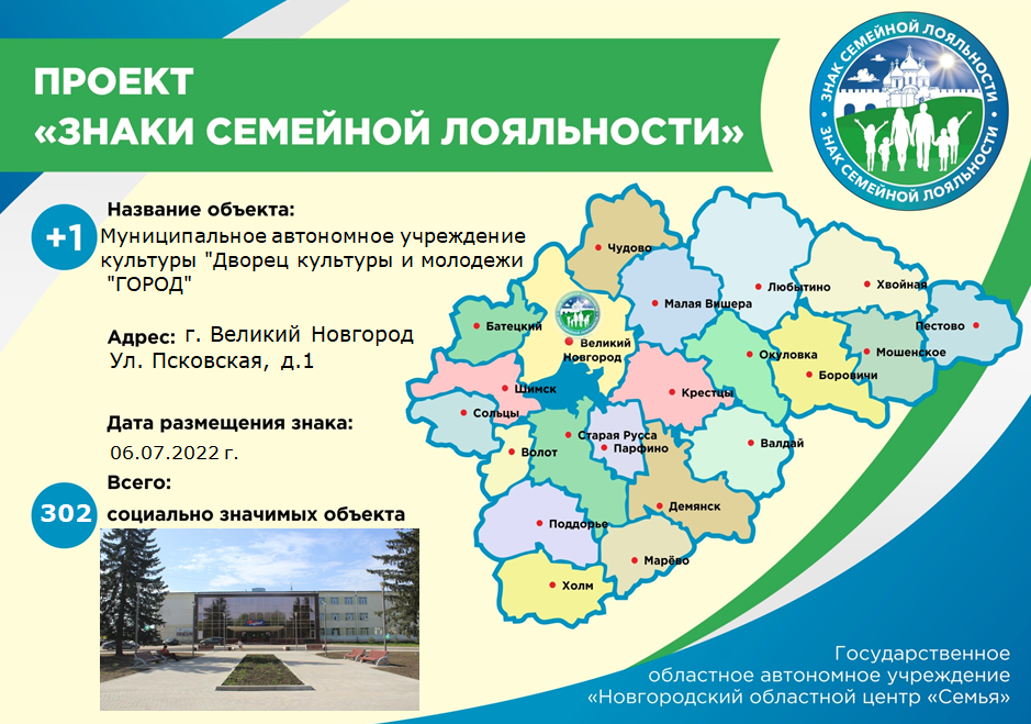 В Великом Новгороде в 2022 году «Знака семейной лояльности» удостоены 5 объектов, в число которых вошёл «Дворец культуры и молодежи «ГОРОД»👏🏻