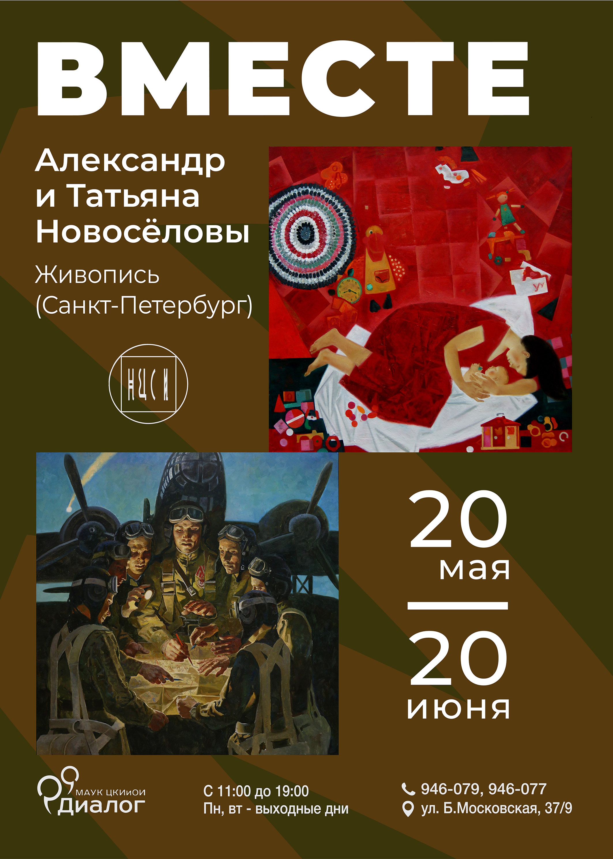 Авторы выставки «Вместе» Александр и Татьяна Новосёловы – известные петербургские художники. Выпускники Академии художеств. Александр с 2009 года – преподаватель Академии. Творческий союз Александра и Татьяны сложился давно, ещё во время обучения. Татьяне, как матери шестерых детей, близка тема материнства, семьи и детства. Она обращается и к жанру натюрморта, в котором создаёт атмосферу присутствия человека, диалога художника и окружающего мира. В пейзажах она воспевает неброскую красоту и лирику, свойственную средней полосе России. Александр часто обращается к исторической теме, в том числе и Великой Отечественной войны. Тема эта, связанная с историей нашей страны и каждой семьи, является частью национального самосознания. В семье художников, также как и у миллионов граждан нашей страны, бережно хранится память о родных и близких, воевавших на фронтах Великой Отечественной, о подвиге защитников Родины, внёсших свой вклад в Великую Победу.