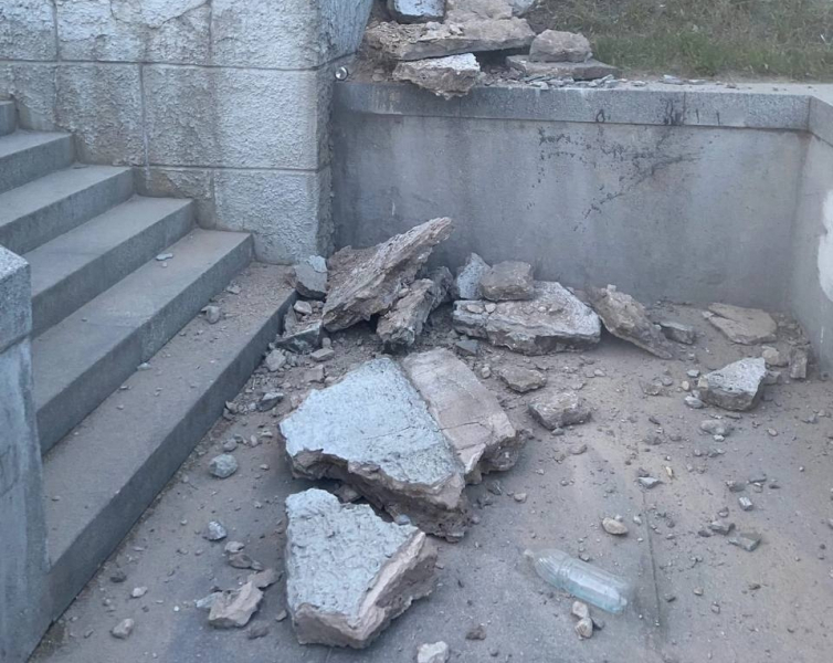 На этот раз отвалились и упали на лестницу довольно крупные куски кладки на колонне со стороны торгового центра «Диез»: