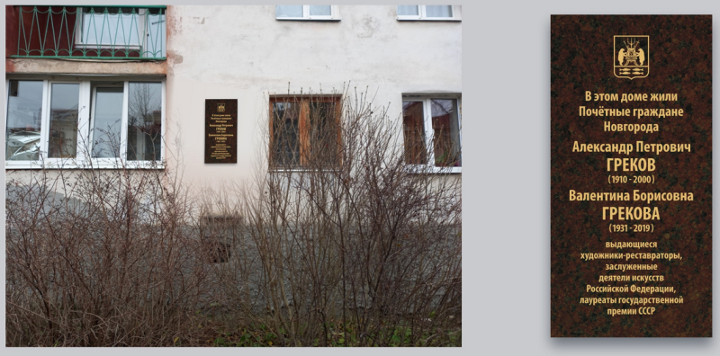 Комиссия по увековечению памяти выдающихся личностей и исторических событий поддержала предложение об установке мемориальной доски Почётным гражданам Новгорода Александру Петровичу Грекову и Валентине Борисовне Грековой, выдающимся художникам-реставраторам, посвятившим свою жизнь восстановлению фресок новгородских храмов, разрушенных в годы Великой Отечественной войны. Всемирную известность приобрело восстановление ими росписей XIV века церкви Спаса Преображения на Ковалеве близ Новгорода.
