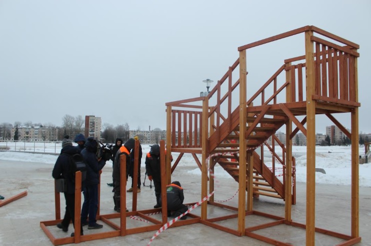 Сегодня, 26 декабря, на Софийской набережной в Великом Новгороде начался монтаж двухъярусной деревянной горки с двумя скатами.