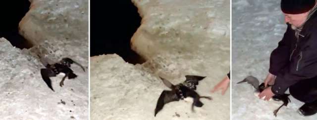 Вечером сегодня, 9 января, новгородский зоолог Андрей Коткин вместе с неравнодушными жителями Великого Новгорода Максимом Комиссаровым и его женой Яной выпустили на волю чернозобую гагару — птицу, занесённую в российскую и новгородскую Красные книги.