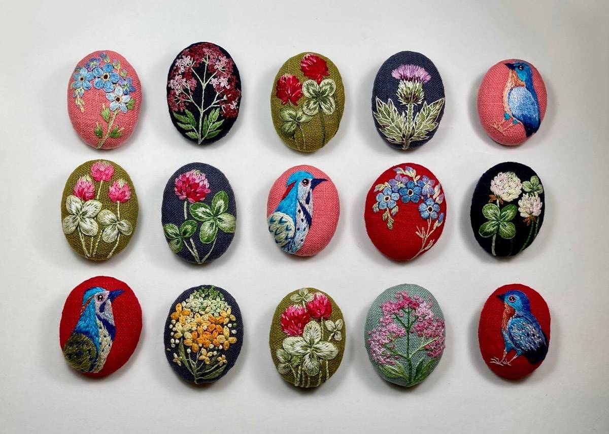 — Конечно, сейчас у меня есть ботанические атласы, я изучаю растения и по ним тоже, но лучше с натуры: обколола все пальцы о чертополохи. Как у них лежат чешуйки, каким швом это передать? Потом всё равно обобщаю. Мотив будущей вышивки можно придумывать долго — несколько дней или недель, а когда он придуман, то работа занимает 3–4 часа, и готово: брошечка есть, — рассказывает Лена.