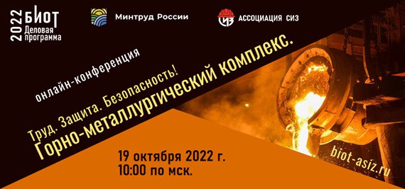 19 октября 2022 года в 10:00 по московскому времени в рамках Деловой программы 26-й Международной выставки БИОТ-2022 состоится онлайн конференция «Труд. Защита. Безопасность! Горно-металлургический комплекс».