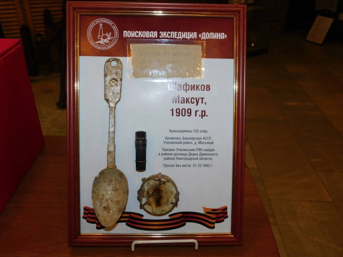Останки Максута Шафикова со смертным медальоном поисковики обнаружили в урочище Дедно Демянского района в ходе Вахты Памяти в этом году. Среди личных вещей обнаружили компас, подсказавший поисковикам, что боец был разведчиком.