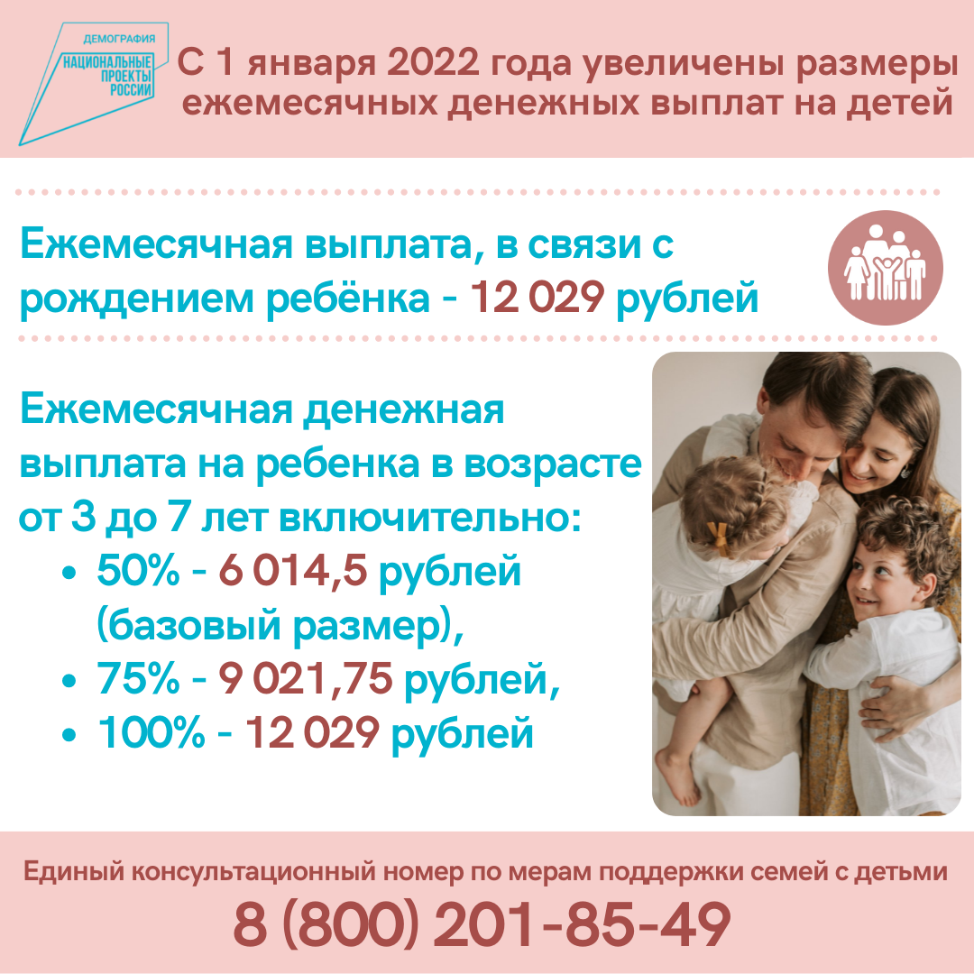 С 1 января 2022 года увеличены размеры ежемесячных денежных выплат, предоставляемых при рождении детей в рамках реализации мероприятий регионального проекта «Финансовая поддержка семей при рождении детей», который является частью национального проекта «Демография».