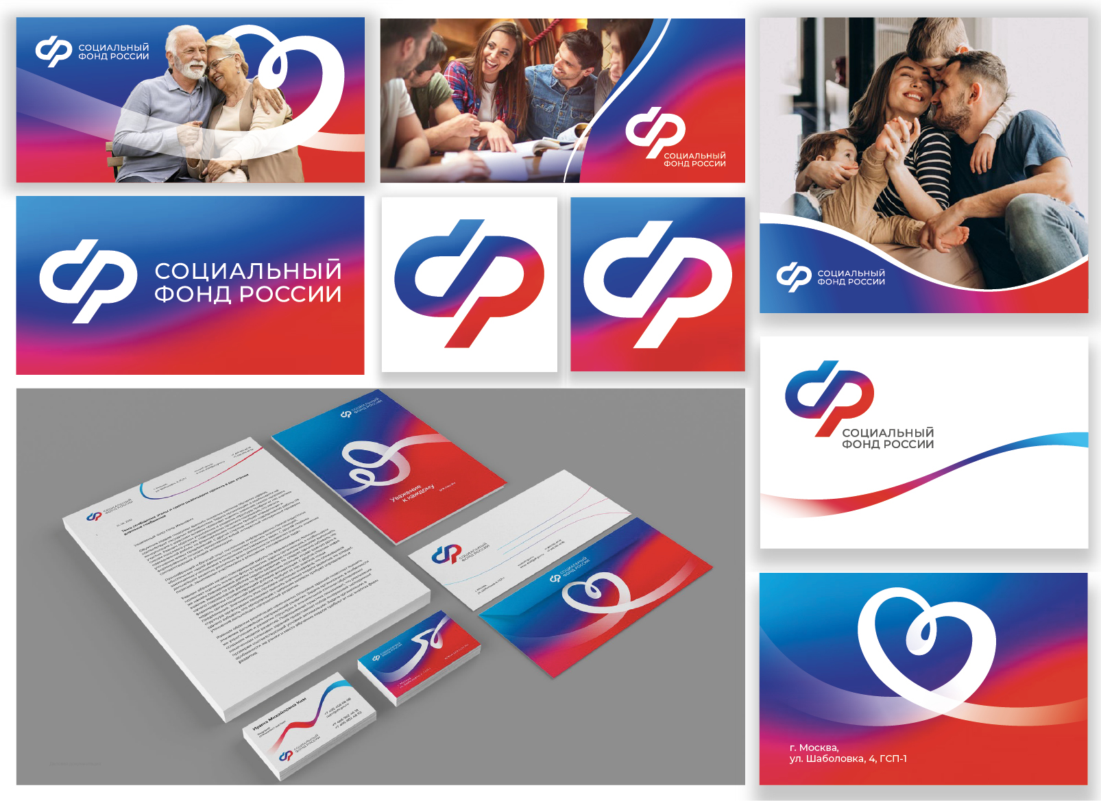 При создании фирменного стиля Социального фонда было разработано несколько версий исполнения логотипа. Окончательный вариант выбран по итогам серии количественных тестов, проведенных с привлечением разных целевых аудиторий, а также качественных исследований при участии непосредственных получателей услуг фонда.