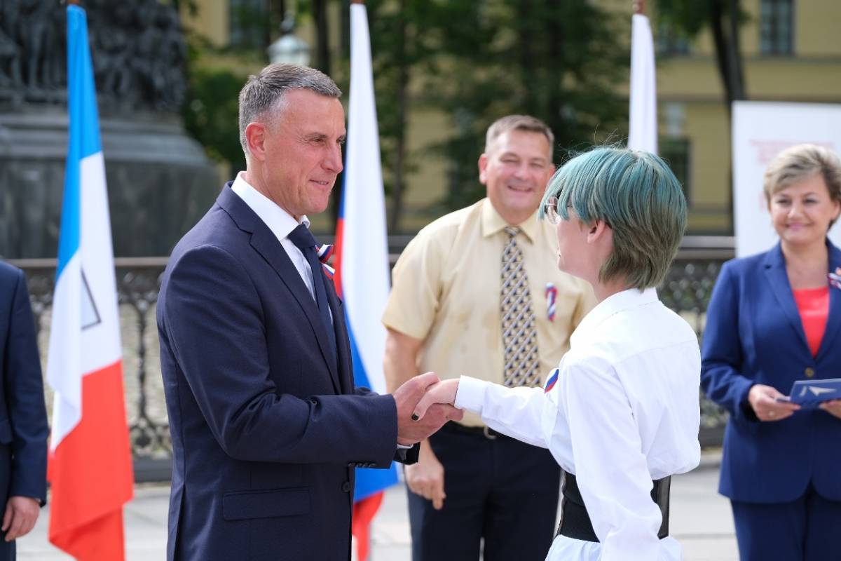 – Сегодня два знаменательных события. Первое – День государственного флага России, второе – вручение паспортов юным гражданам Новгородской области, – сказал первый заместитель губернатора Новгородской области Евгений Богданов. – И оно неслучайно происходит именно сейчас. Получение паспорта закрепляет ваши права, но и обязанности: уважительно относиться к тому, что вы граждане великой страны, к символам России – флагу, гимну. Поздравляю всех новгородцев и гостей с замечательным праздником. Желаю нашему городу, нашей стране и всем ее жителям благополучия и развития!