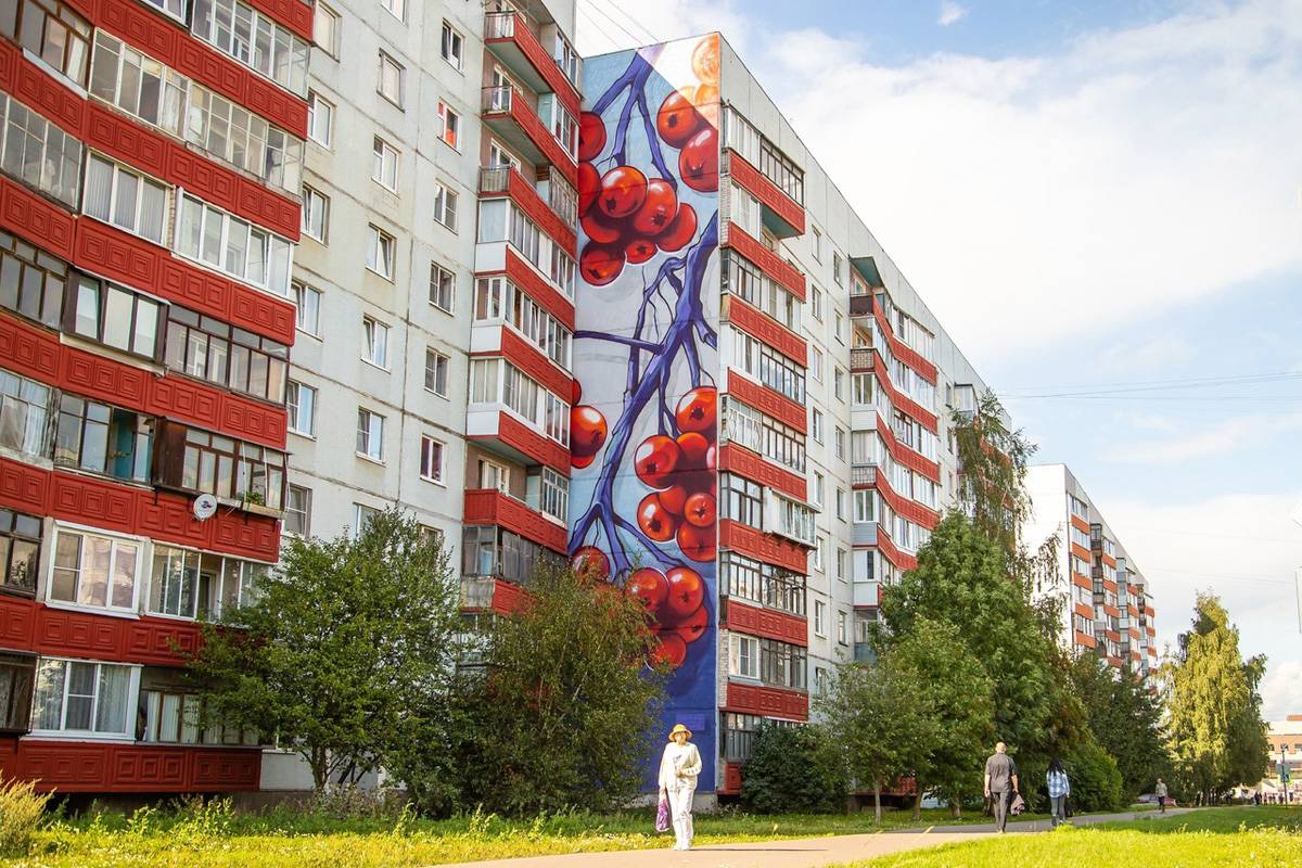 Западный микрорайон Великого Новгорода украсил мурал с веткой рябины
