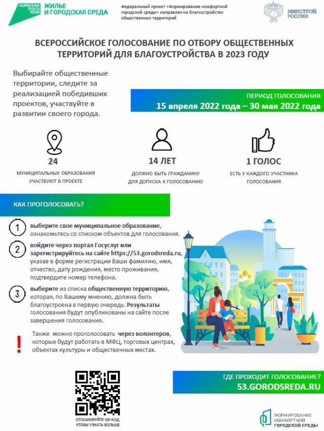 Вчера, 15 апреля, в России стартовало онлайн-голосование по выбору приоритетных объектов для благоустройства в 2023 году, которое продлится до 30 мая включительно, в рамках федерального проекта «Формирование комфортной городской среды» входящего в состав национального проекта «Жильё и городская среда».