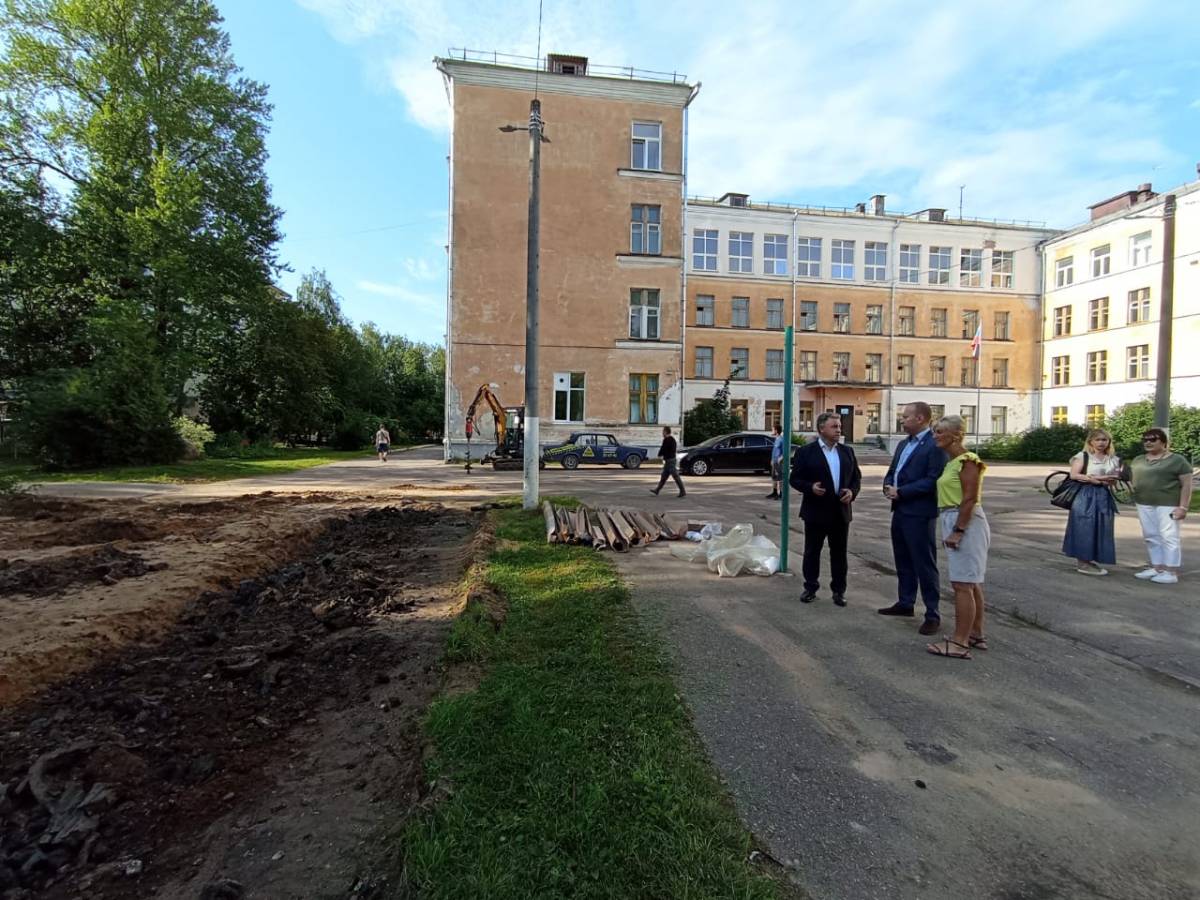 Сейчас небольшой участок у школы подрядчик приводит в порядок.