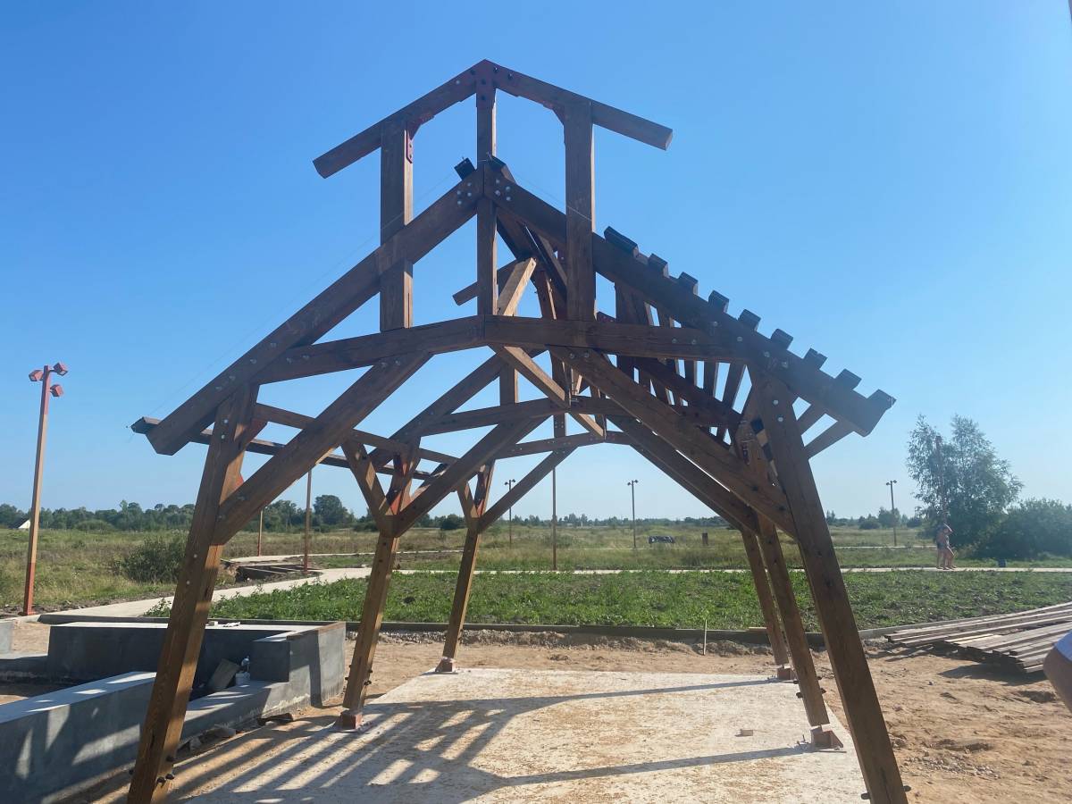 Секретарь местного отделения партии, глава Старорусского района Елена Комарова вместе с подрядчиком ООО «ТехСити», архитекторами и дизайнерами Центра развития городской среды Новгородской области присутствовали во время установки входной зоны в виде градирни. Кроме того, продолжается монтаж деревянных конструкций.