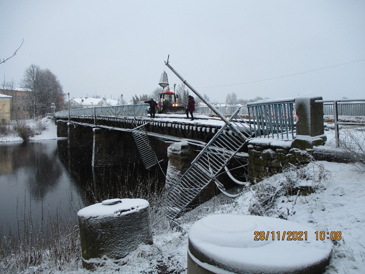 Ночью в Старой Руссе автомобиль проломил перила Живого моста. По сообщениям очевидцев, машина в реку не упала; повреждены перила, деревянный отбойник, опора фонаря.