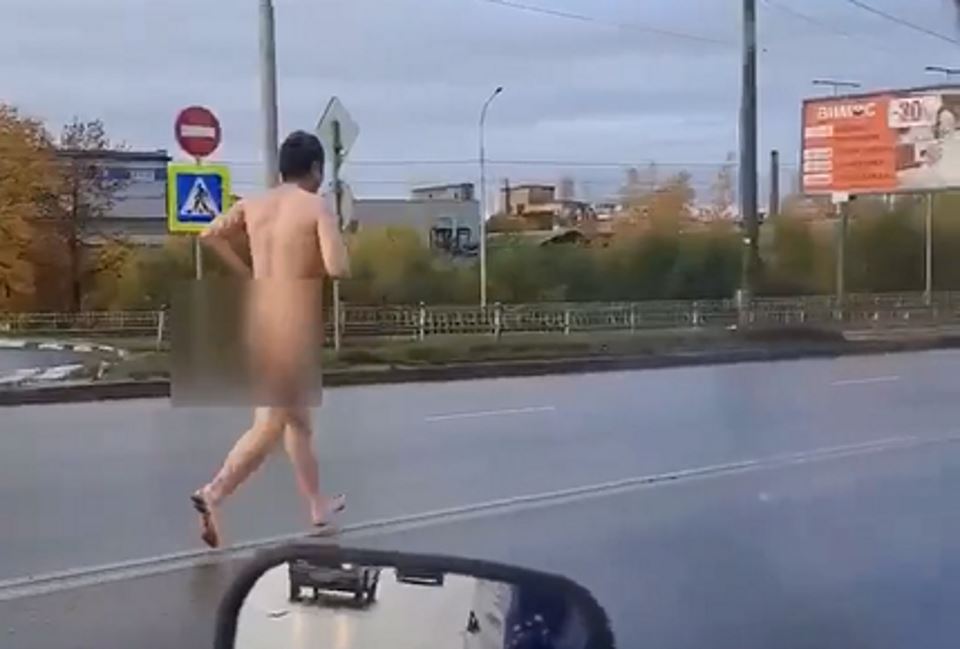 В социальных сетях появилось видео, на котором мужчина без верхней одежды со спущенными трусами бежит по середине проезжей части Колмовского моста.