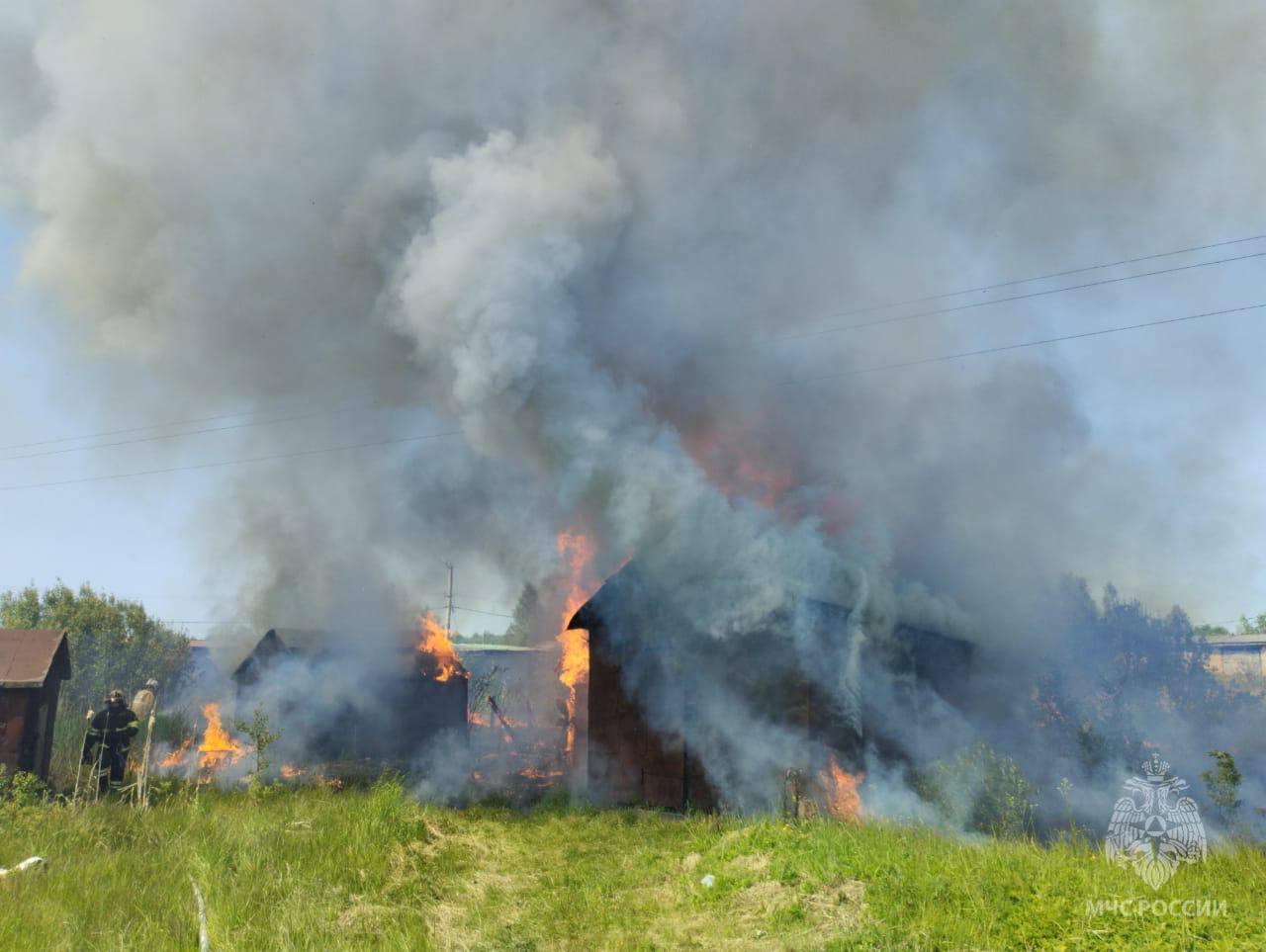 © ГУ МЧС России по Новгородской областиСообщение о пожаре поступило в экстренные службы в 13:21. На момент прибытия сотрудников пожарно-спасательных подразделений горело несколько хозяйственных построек.