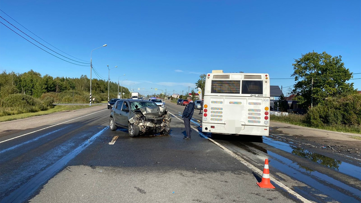 На Псковском шоссе разворачивающийся автобус столкнулся с автомобилем