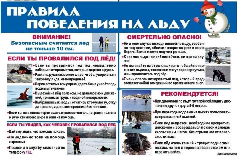 Перед вскрытием рек, озер, водоемов лед слабеет, становится рыхлым, опасным для перехода. Особую внимательность необходимо проявлять при выходе на лед в местах зимнего лова рыбы. Выходить на необследованный лед опасно, при необходимости перехода нужно пользоваться палкой-пешней, проверяя прочность льда. Особенно осторожно нужно спускаться с берега - лед может неплотно соединяться с сушей, возможны трещины, подо льдом может быть воздух. Также лед непрочен около стока вод, в местах произрастания растительности, под сугробами.
