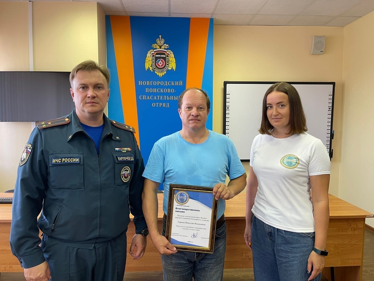 Сегодня в стенах Новгородского поисково-спасательного отряда заместитель начальника Главного управления МЧС России по Новгородской области Дмитрий Карпочев и представитель пресслужбы поисково-спасательного отряда «Феникс» Ирина Чурсинова наградили Вячеслава Валерьевича Туркова - парапланериста, благодаря которому удалось быстро найти женщину и двоих детей, заблудившихся в Старорусском районе.
