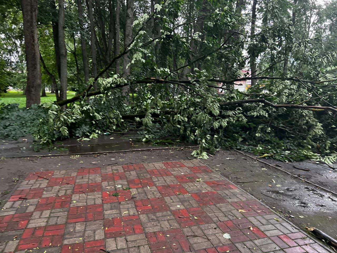 В Великом Новгороде убирают поваленные из-за сильного ветра и грозы деревья