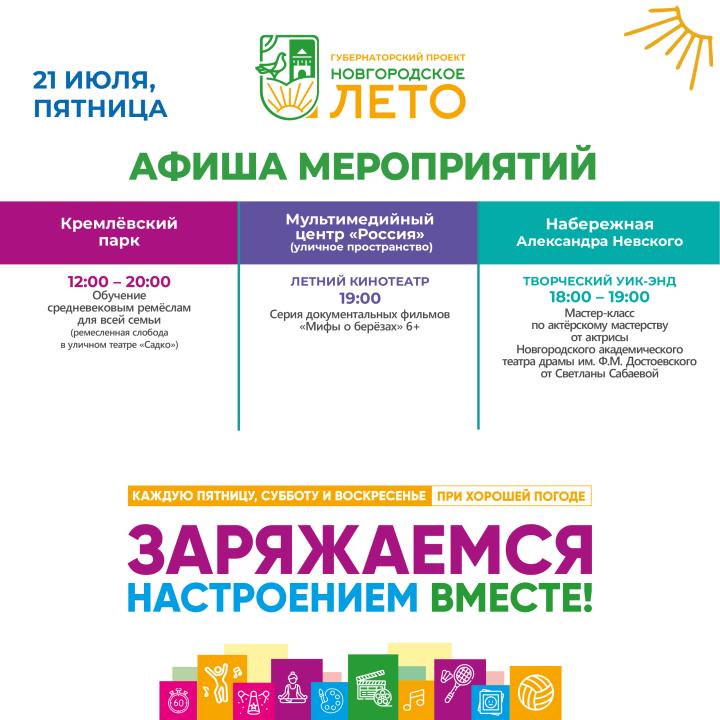 В Великом Новгороде 21 июля ,в пятницу, вечером и в выходные, 22 и 23 июля, подготовлена обширная программа из развлекательных и познавательных событий.