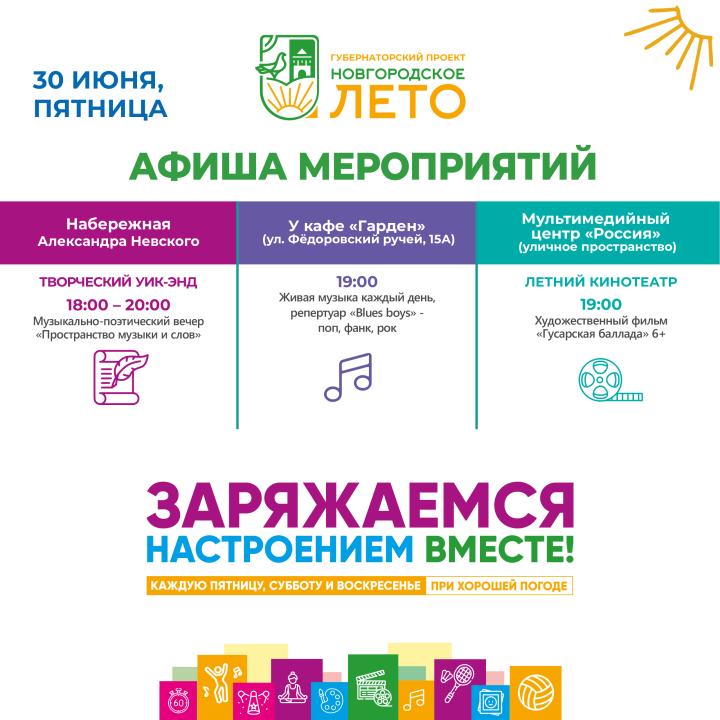 Афиша мероприятий фестиваля "Новгородское лето" в Великом Новгороде на 30 июня, пятница