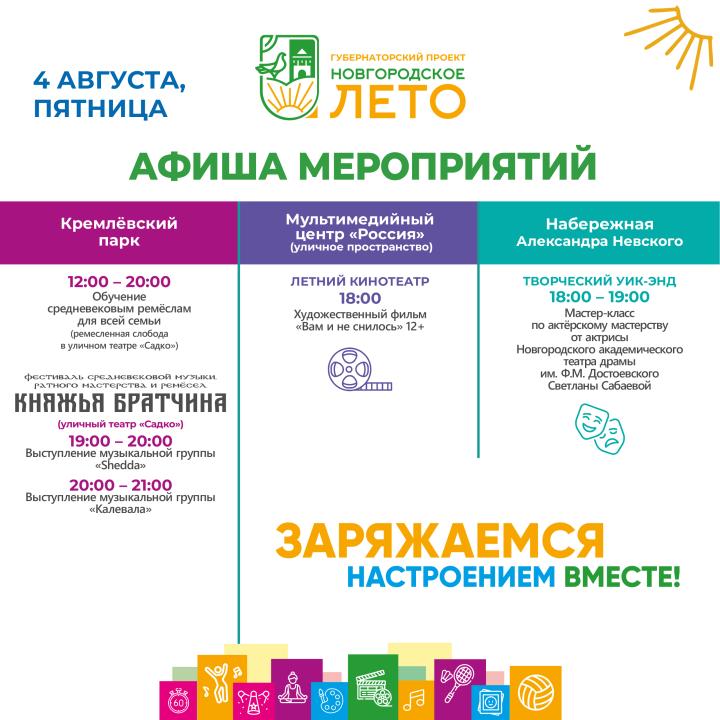 Афиша событий фестиваля «Новгородское лето» с 4 по 6 августа