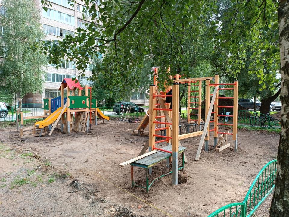 Работы во дворе начались в начале июня: было демонтировано аварийное оборудование, покрашен забор, сделано освещение и установлена новая детская площадка. Сумма контракта составила 1,7 млн рублей.