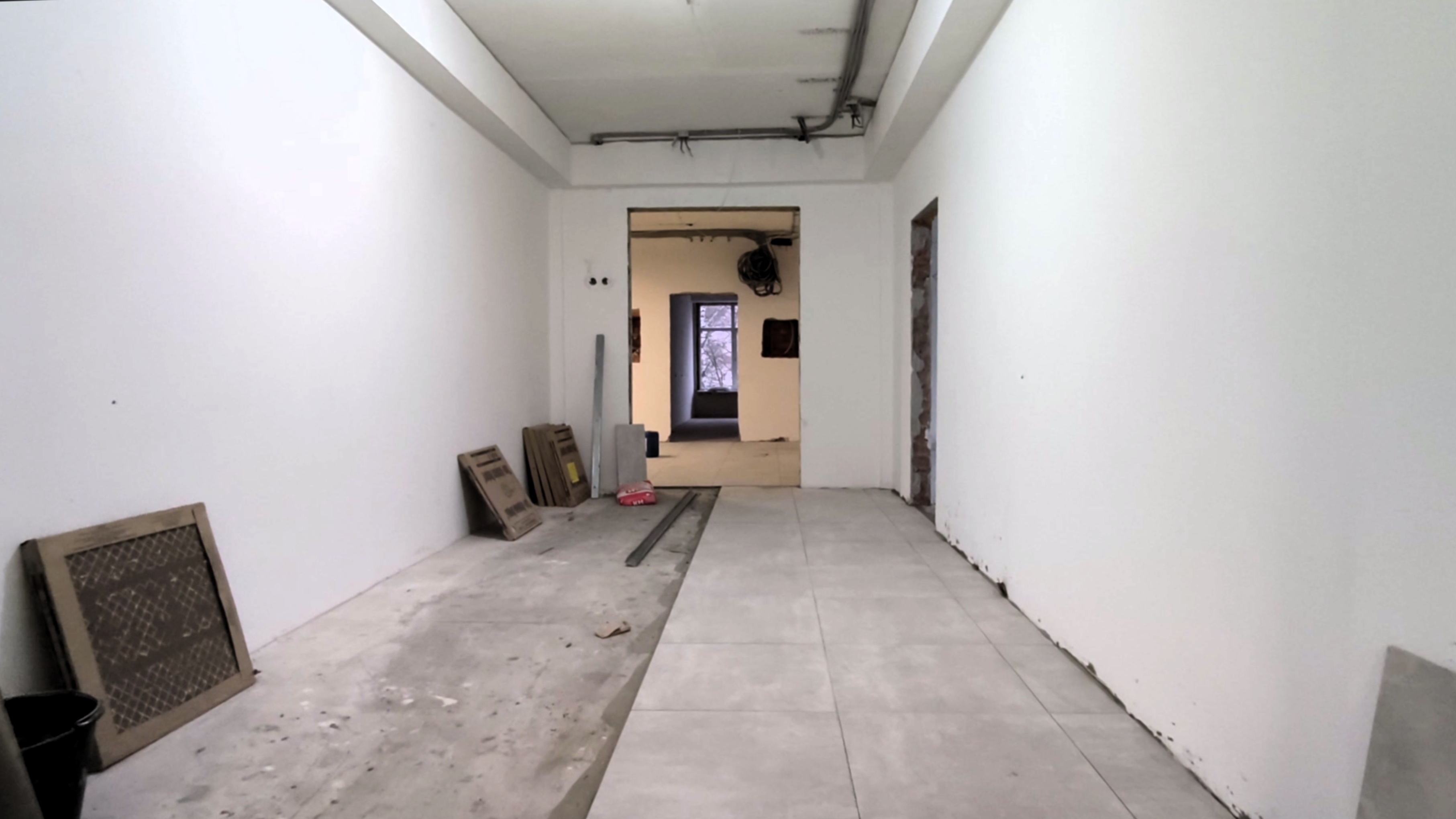 В нём сообщается, что сейчас рабочие заняты укладкой на пол керамогранита и подготовкой к установке плинтуса из керамогранита. Уже завершается подготовка к устройству подвесных потолков. Специалисты ошкуривают стены под шпаклёвку.