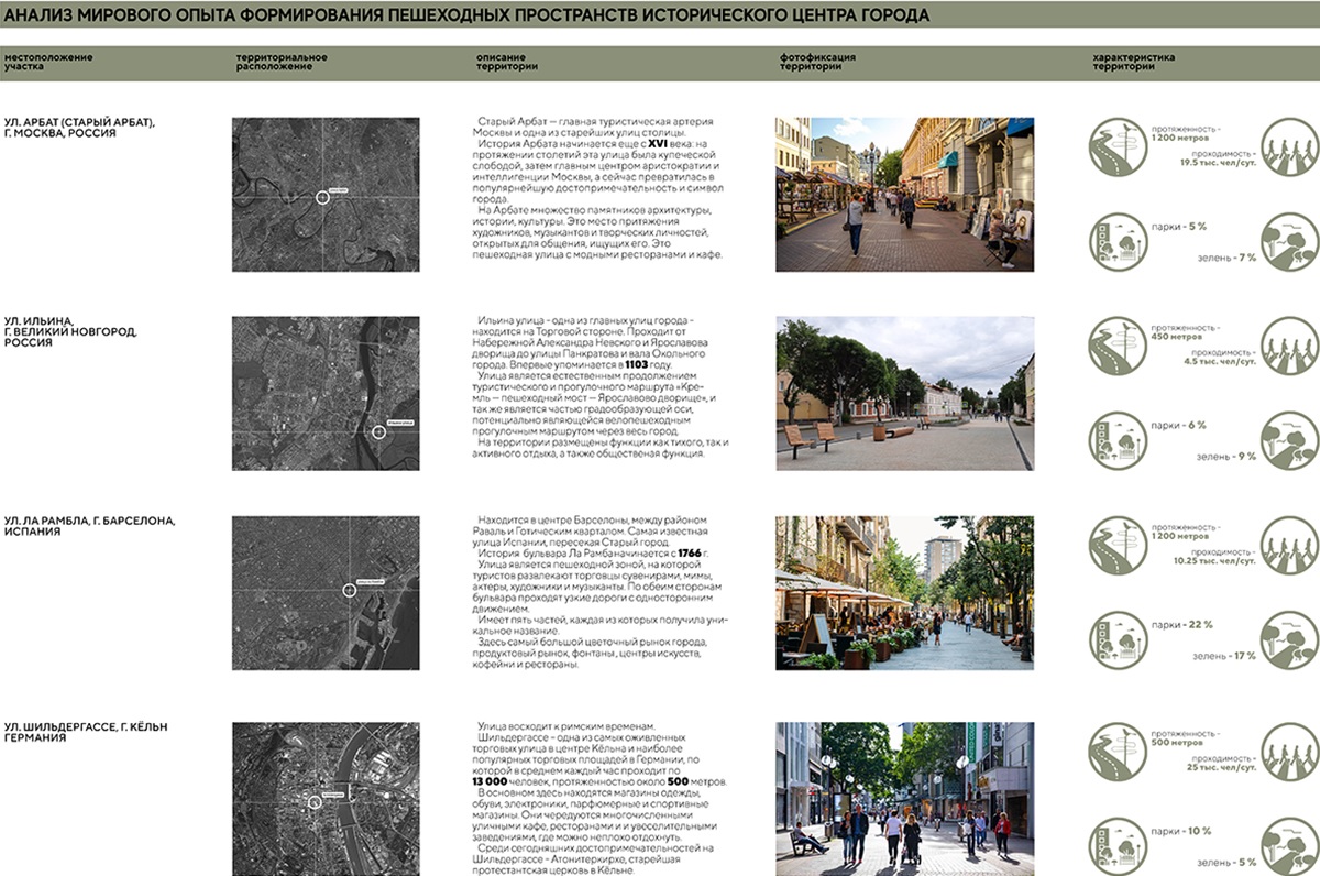 Для анализа пешеходных пространств были выбраны первые четыре по площади города после Великого Новгорода. Это Боровичи, Старая Русса, Чудово и Валдай. По итогам анализа видно, что в городе Старая Русса, втором туристическом центре области, имеется одна пешеходная улица — Воскресенская, переходящая в Соборную площадь, где сосредоточены зоны отдыха, общения и праздничных мероприятий. Территория улицы Некрасова — прогулочного променада города Чудово, и современная набережная в городе Валдай не имеют велосипедной инфраструктуры. В городе Боровичи отсутствуют территории, формирующие активный городской центр и развивающие культурную и экономическую деятельность, в связи с чем был выбран именно этот город. Мой